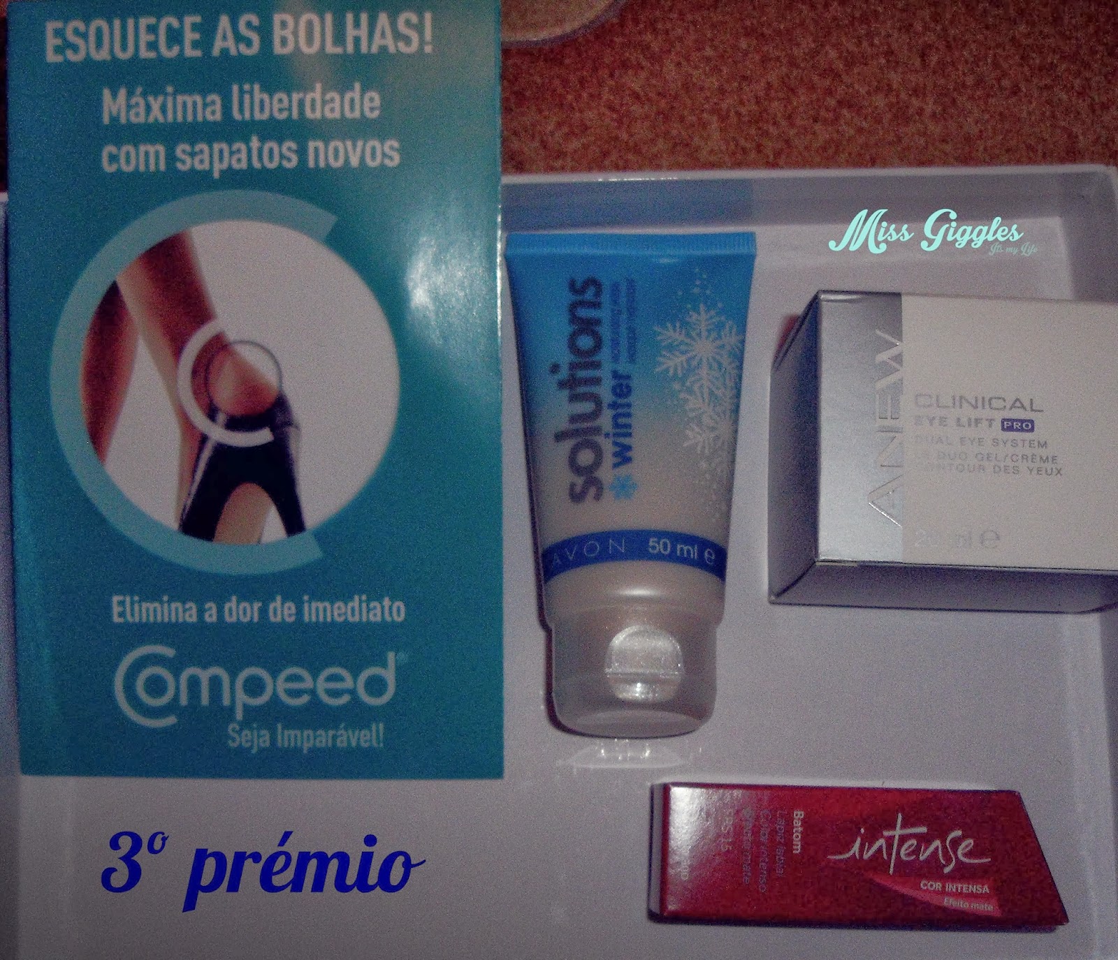3º PRÉMIO 1 amostra compeed, 1 mascara facil Avon, 1 creme para olhos noite Avon e 1 batom OBoticário |
